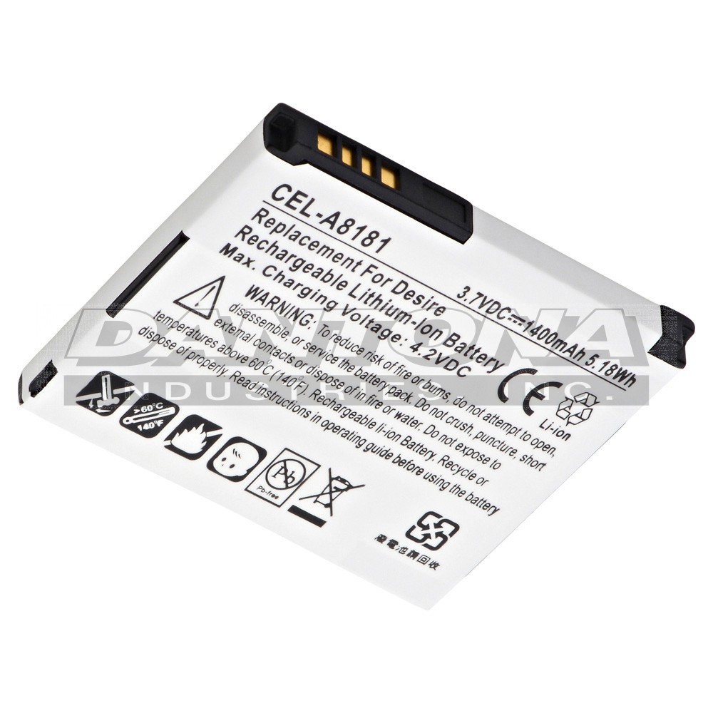 This replacement 3.7 Volt 1400mAh Lithium Ion battery fits the HTC A8181 Cellular Phone and meets or exceeds original manufacturer specifications.